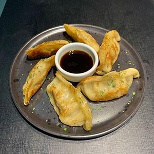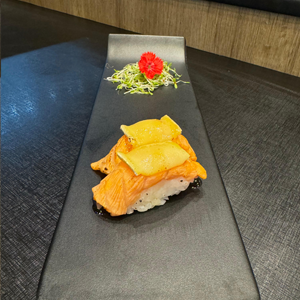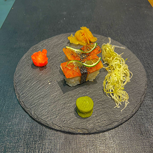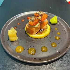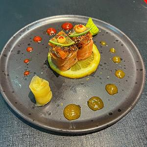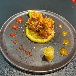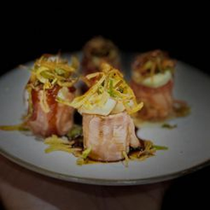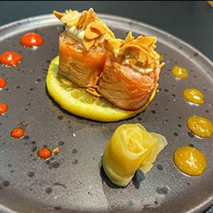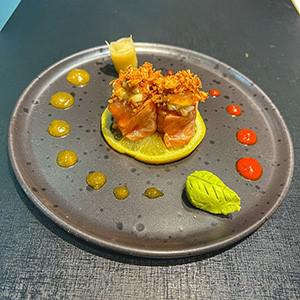Arroz envolto por salmão maçaricado e recheio de cream cheese, finalizado com geleia de limão siciliano e crispy de alho poró.