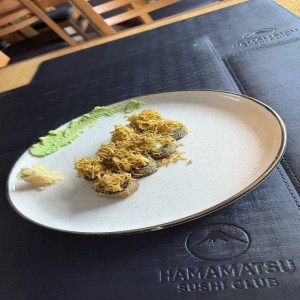 Arroz envolto por salmão e recheio de cream cheese , tarê e crispy de couve.