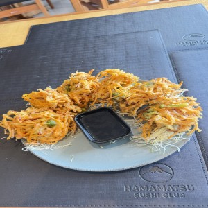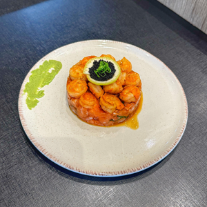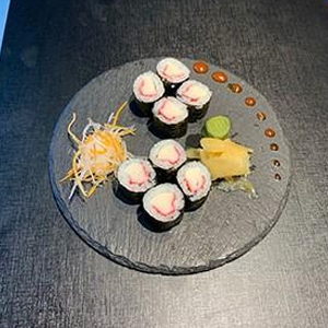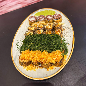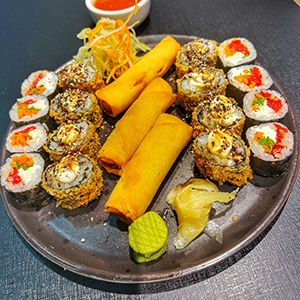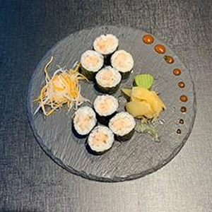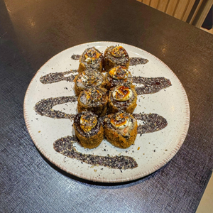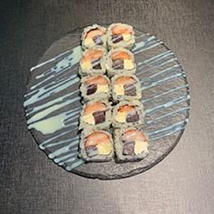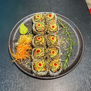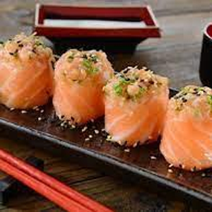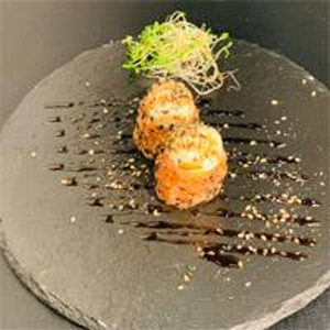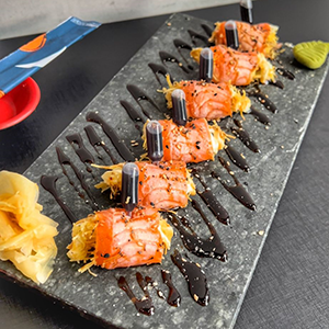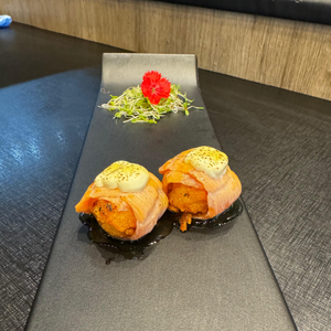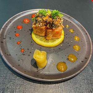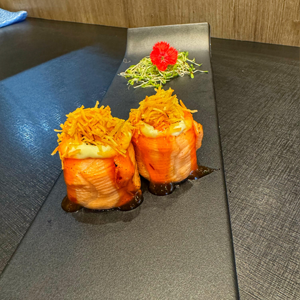 Arroz envolto por salmão maçaricado e recheio de cream cheese, camarão empanado, finalizado com tare e gergelim.