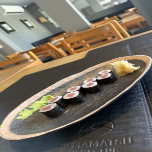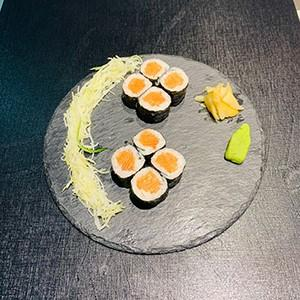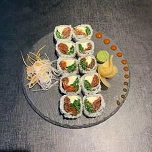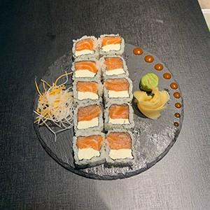 Arroz envolto por salmão e recheio de cream cheese, finalizado com tarê e gergelim.