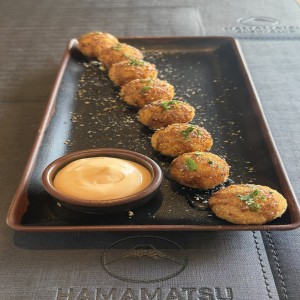 Arroz, alga, salmão e cream cheese, empanado na farinha panko e frito.