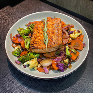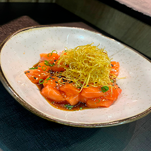 Cubos de salmão com delicioso e exclusivo molho de ostra com tempero do chef.