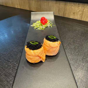 Arroz envolto por salmão maçaricado com recheio de ovas black.