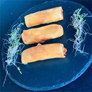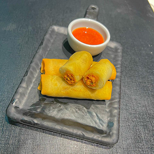 Rolinho primavera com recheio de carne bovina, acompanha molho do chef.