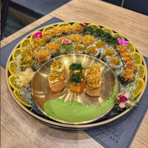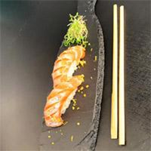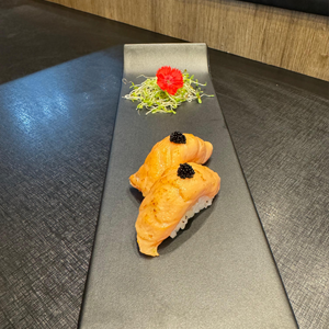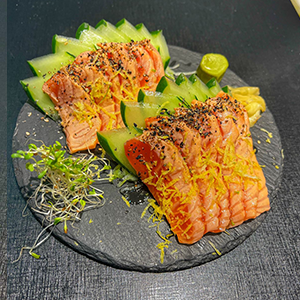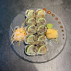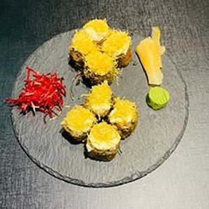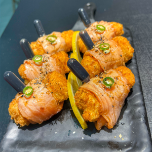 Arroz envolto por salmão maçaricado e recheio de cream cheese, salmão empanado, fina fatia de limão, maionese, pimenta, tarê e gergelim.