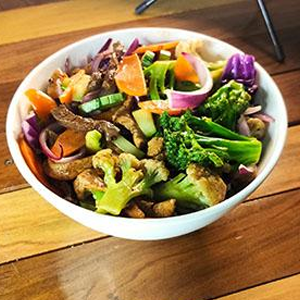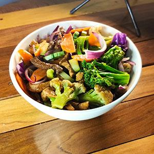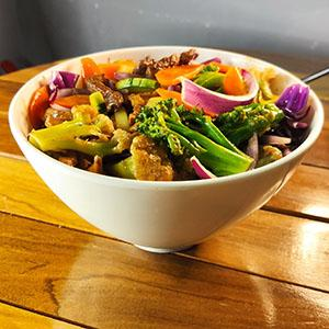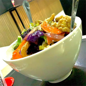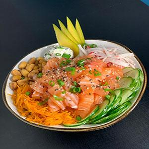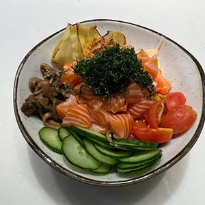 Gohan, Furikake, Tomate cereja, Shimeji, Pepino, Crispy de cebola., Salmão, Maionese Spicy, Chips de batata doce, Crispy de couve.
