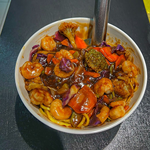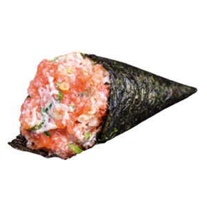Gohan, Furikake, Kani, Pepino, Cenoura saborizada, Milho crunchy, Cream cheese, Salmão, Cebolinha e Manga.