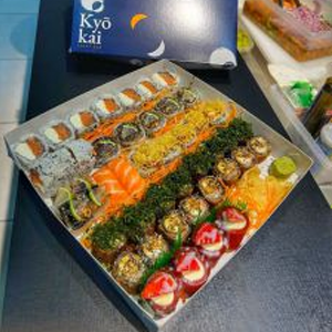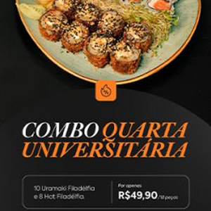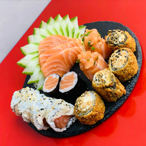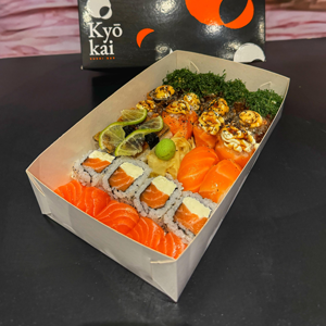 12 Sashimis de Salmão, 8 Hot Filadélfia, 8 Hossomakis de salmão, 10 Uramakis Kanidelfia, 10 Uramakis Filadélfia, 4 Niguiris de salmão, 6 Croquete de Salmão e 4 Hot Nutella.
