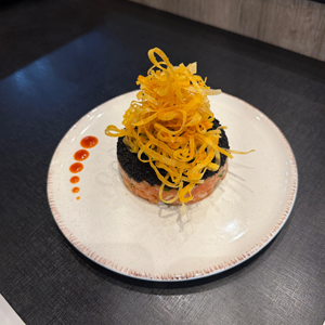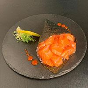 Arroz envolto por salmão maçaricado finalizado com cream cheese, queijo brie, geleia de pimenta e crispy de batata doce.