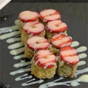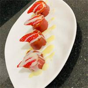 Cream cheese envolto por fina fatia de goiabada finalizado com morango e leite condensado.