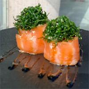 Arroz envolto por salmão e recheio de shimeji na manteiga finalizado com tarê, gergelim e cebolinha.