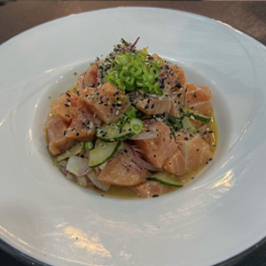 Pequenos cubos de salmão com cebola roxa, pepino e tempero do chef.