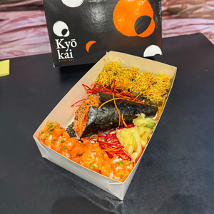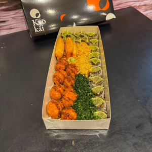 10 uramakis skin lemon, 8 croquetes de salmão, 4 hot crispy de couve, 4 hot crispy de batata doce, 4 niguiris skin lemon e 4 harumakis de salmão.