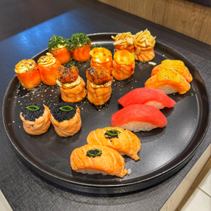 10 uramakis Filadélfia especial, 10 uramakis ebitem especial, 10 sashimis spicy e 10 sashimis ao molho de maracujá.