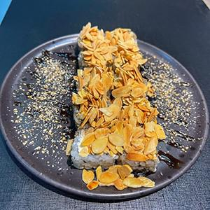 Arroz envolto por salmão maçaricado com cream cheese e lascas de amêndoas.