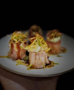 Cubos de salmao com delicioso e exclusivo molho de ostra com tempero do cheff.