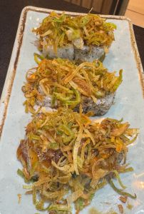 1 Temaki Filadelfia, 4 Gunkan Jhow e 8 Hot Crispy de Batata Doce
